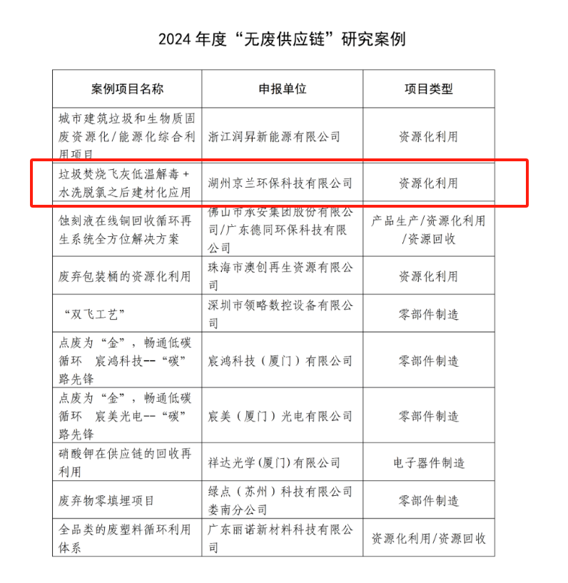 根據(jù)案例研究及匯報情況,本年度評選出10項“無廢供應(yīng)鏈”評價試點(diǎn)及10項“無廢供應(yīng)鏈”研究案例。湖州京蘭環(huán)??萍加邢薰緫{借 “垃圾焚燒飛灰低溫解毒 + 水洗脫氯之后建材化應(yīng)用” 項目脫穎而出,成功入選 “無廢供應(yīng)鏈” 研究案例。